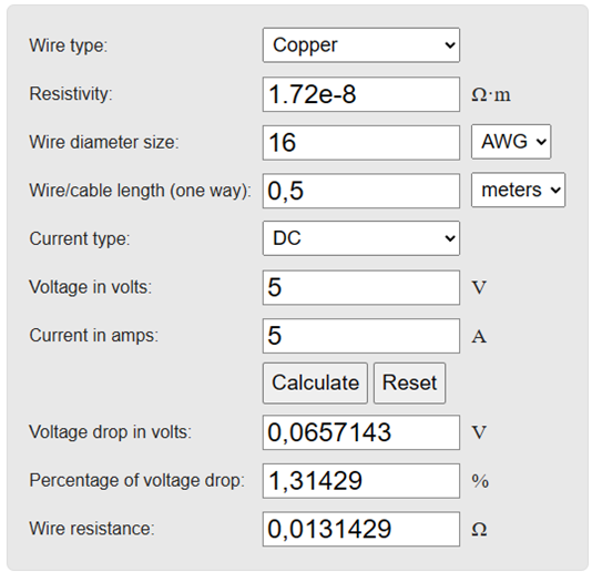 ” to the config.txt, the Pi now skips this check and continues booting. The relief lasted for about 2 seconds when the Pi shut down again. At this point we suspected electrical issues. We would see current ramping up on the power supply monitor before a sudden shutdown, suggesting behaviour connected to high currents. By measuring the test wires, we found them to have a total of 0.4 Ohms resistance resulting in an astronomical voltage drop across the cable. With a properly dimensioned cable using the formula below, with resistance lower then measurable with our multimeter, we were now able to test sucessfully, and reminded of the importance of proper wiring.