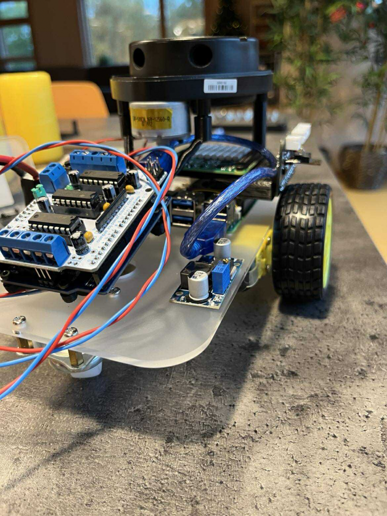 We came up making a differential drive three-wheel car. With some premade parts and some rookie CAD and 3D printing. We are quite lucky in this department since Herman, and I have dabbled in some CAD, and I have a 3D printer at home. This made it possible to start testing and printing some parts. So, Sunday evening we had this: