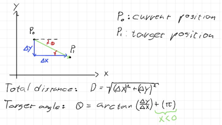 Next, we want to be able to tell the vehicle to move to any arbitrary position we tell it (within reason of course), this, at least initially, will be achieved by first rotating to face the target position, then driving the distance to the target position.
