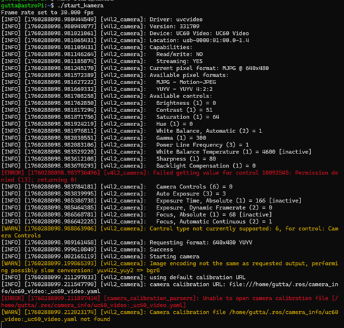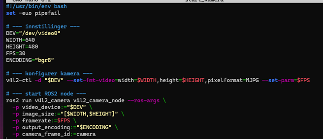 I created a script that sets the camera formatting and starts the camera node, allowing me to launch the video publisher with a single command and specify the desired configuration. This also made it easier to test different camera settings. The FPS and resolution can be adjusted as needed. After testing several combinations, I found that 30 FPS and a 640×480 resolution provided the most stable performance.