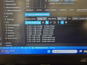 Next I started testing the robot in the environment we want it to move in. My goal was now to make it return the correct scenes. I wanted it to return scene::clear if the path was clear. And I wanted it to return the correct scene for when it is a box in the path or if it has encountered a wall. This was done by changing the tolerances to the size of the arena.