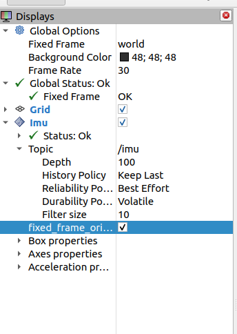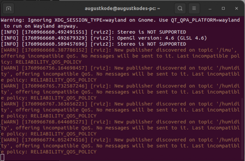 I checked the ros2 topic list, and the topic was up. I veryfied that the node was publishing, by doing ros2 topic echo /IMU. Everything worked well. I then wanted to try to see the visualization in rviz2. I Opened rviz2, and added /IMU, but nothing happend. The terminal said: