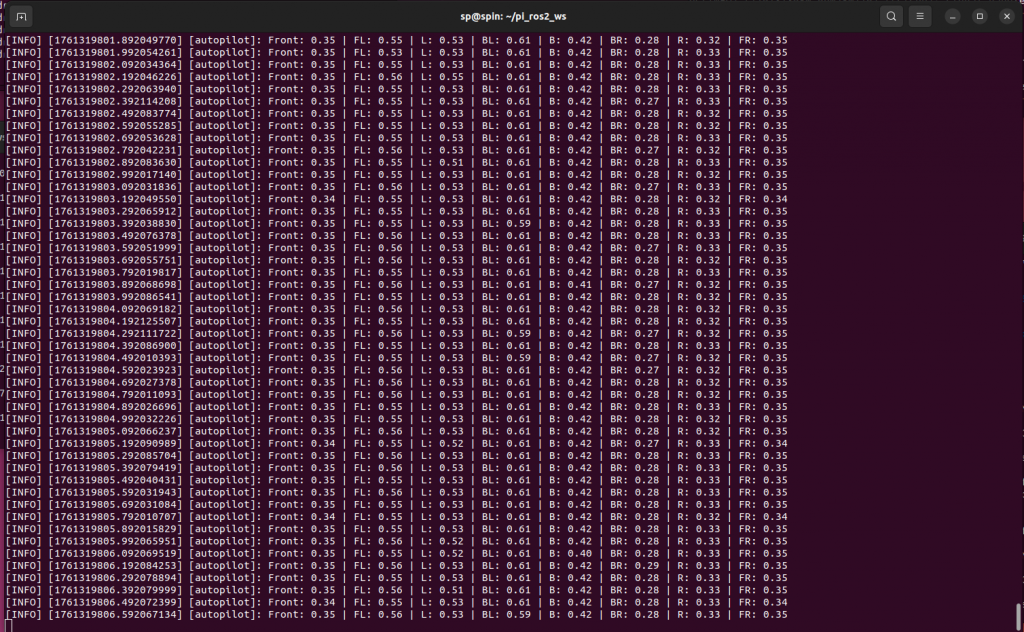 To get started on the autopilot node, I divided the lidar into 8 sectors to get 45 degree sectors, in the same way as the cars movement, Forward, Left-Right, Right etc. Created a simple print program to check if the directions was correct and the readings were good. This method provides a simple collision avoidance logic that uses rover_frame to take decisions based from the rovers perspective, and issues simple control commands to the micro-bit to turn the rover if a object appears in its path. This was more of a learning experience than it was relevant to our project, since we want to use SLAM to map and navigate using the global frame transformed from the car using IMU data, instead of the relative frame of the rover.