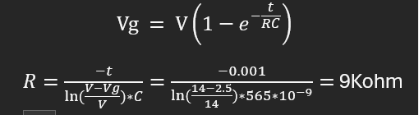 According to the datasheets the input capacitance of the mosfet is around 565nC and the supply voltage to the gate around 14V. Since the minimum gate voltage is 2,8V, we can conclude that at is 1 the voltage at the gate is already around 8.8V so above the minimum gate voltage. Therefor we can calculate the resistance by changing the
