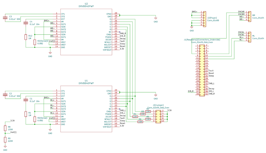 The DRV8840 Also has sleep mode, Fault detection, reset, Drive, Direction and decay inputs and outputs. The pins of sleep mode, decay, fault detection and reset are bridged between the 2 controllers for the left and right motors to take up les pins in the raspberry. The other pins have a sepret connection to the Raspberry. All pins can be connected directly to the raspberry due to the internal logic of the MCU functioning from 2VDC.