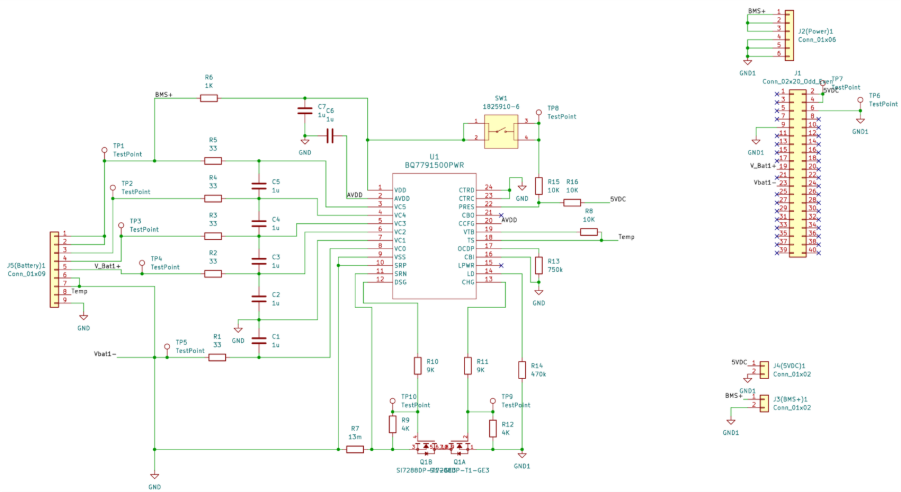 The BQ77915 from texus instruments has a hibernate mode. In this mode the current draw of the chip is reduced to 2 micor amps. To wake the system up a power switch is connected to the press pin with a 10Kohm resistor. When this is pressed the raspberry supplies the 5V needed to keep the BMS from entering hibernate mode. To enter hibernate mode the entire battery has to be disconnected to make sure the raspberry is not supplying the press pin.