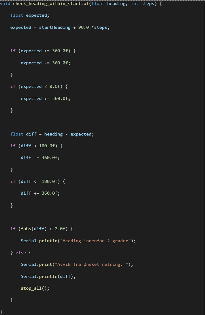 And as you can also see in the video. If it does not stop exactly where it should it corrects. This is done by having a condition in the main logic. If the scene is clear and the heading is of by more than 5 degrees, it corrects a bit in the other direction.