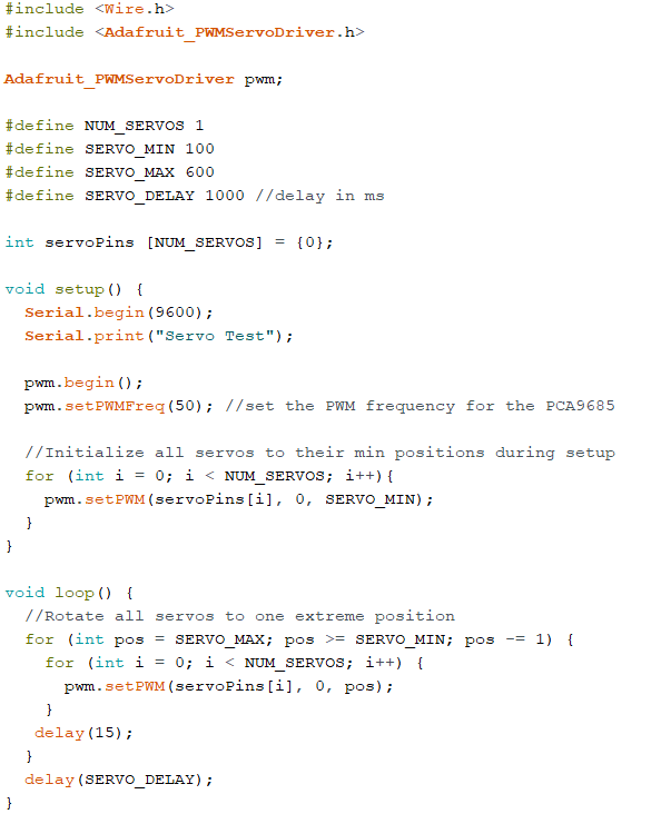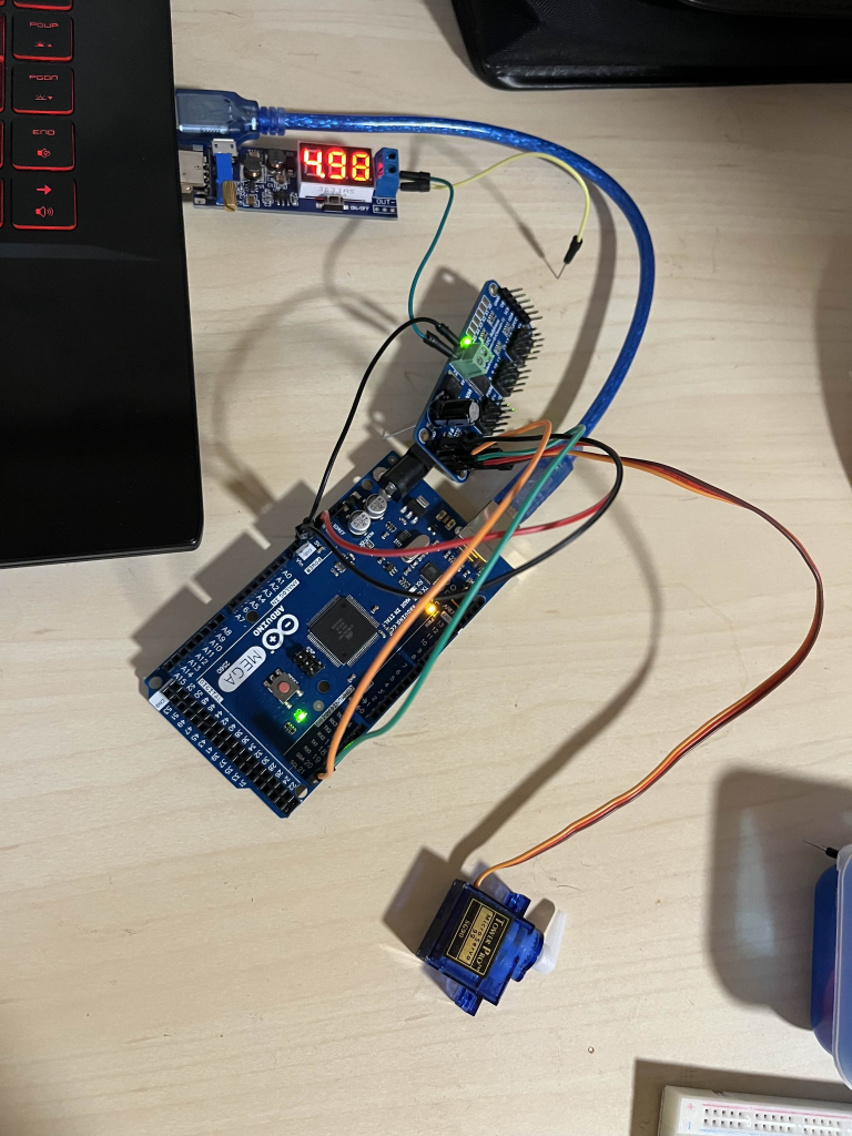 This week has again been a bit busy due to an assignment in “Reguleringsteknikk 2” that I also had to work on. Despite this I did finally get to test the servo controller board (PCA9685) with a servo motor. I started by testing the servo motor itself with a basic code on the arduino mega, before connecting the board to test it. I only have one motor and we are going to use 2, but this should easily be implemented. I borrowed the power supply module from Sondre which made the testing easier. I did notice when testing the module that the power output didn’t match the value I got on my multimeter, but it was not far enough off that it made a difference.