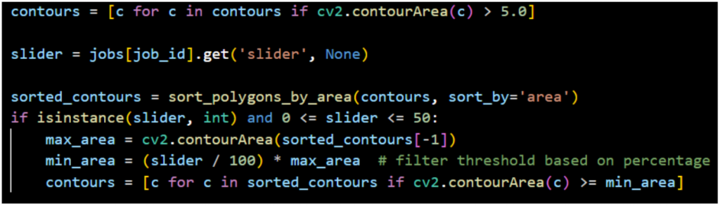 The other part of the code uses the sorting and decide what contours get removed from the image. So far, it’s the specified value coming from the frontend; for this test, I set it at 50.