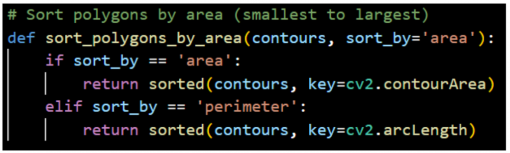 The function above is what I started with to have something to go off of when trying to figure out how to use it in the rest of the code. This is to remove the polygons that have the least amount of coordinates (area of the polygons), so this sorts them from the smallest to the largest.