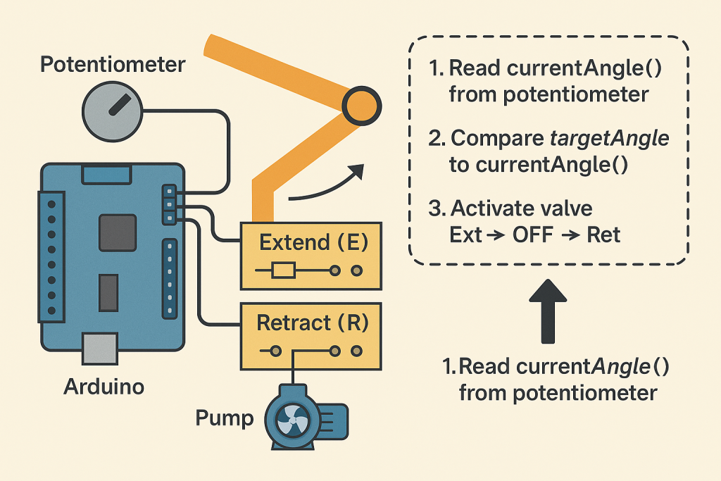 Each valve isn’t just one channel, it actually uses two! One for Extend (E), and one for Retract (R). And the pump? It’s its own little controller that only turns on when the system is in motion. No movement, no pump. Then there’s the potentiometer, which gives us the live position of the joint, in our case, that’s what we call the currentAngle(). The code compares that to the targetAngle(), which is where we want the arm to be.