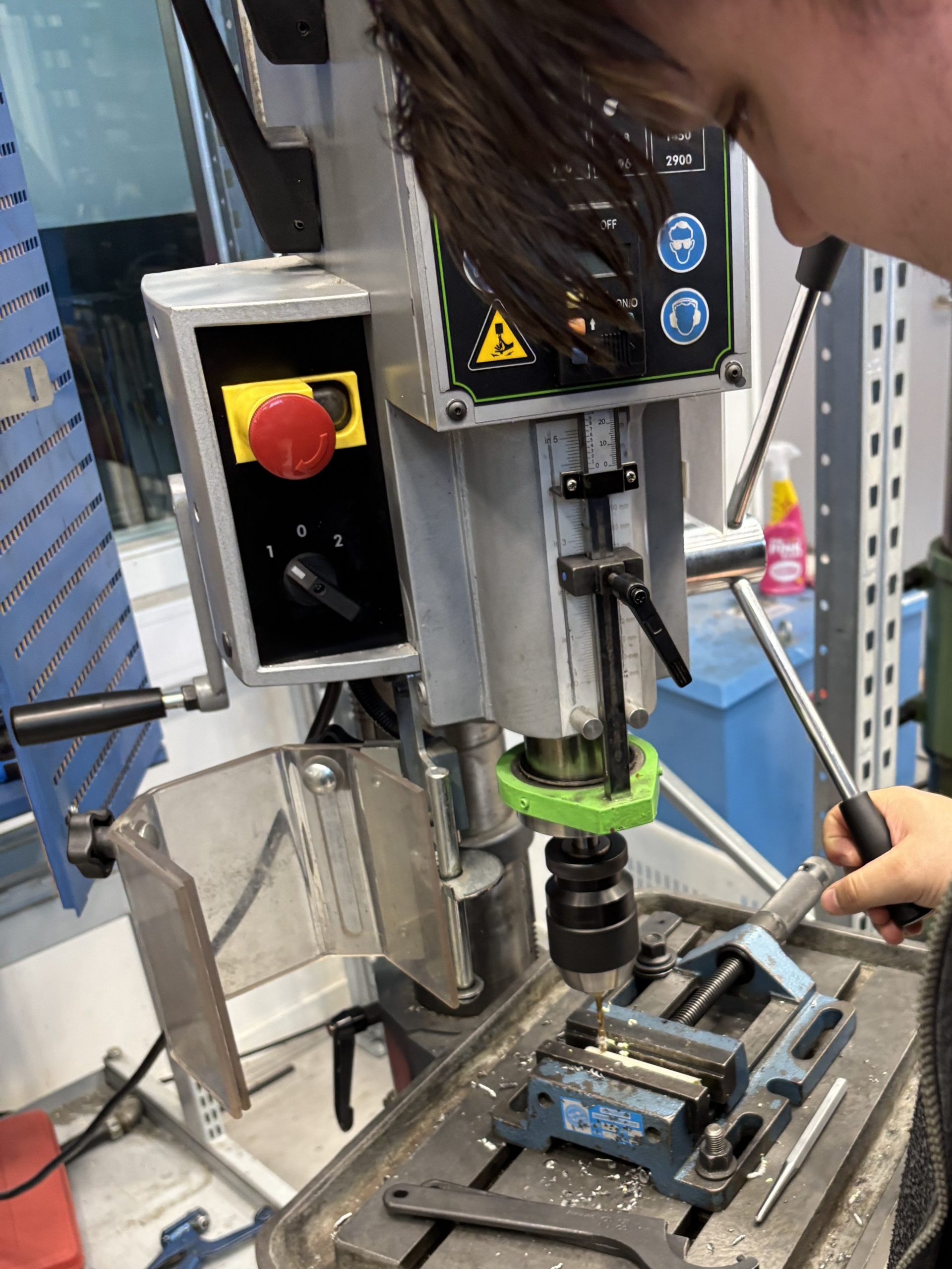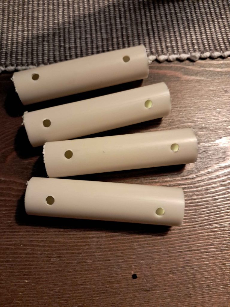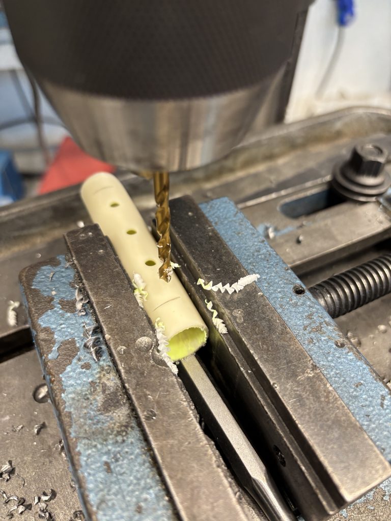 A while back I bought a long tube of diameter 20mm pvc pipe at Clas Ohlson, and used this as the base of the hydraulic cylinder. Now that I know the exact dimensions and features of the cylinder, I can finally put it to good use. Me and Erling used the prototype lab at school to cut the pipe into 80mm segments with the bandsaw, and drilled 4.5mm holes on the tube surface with the column drill. Erling also designed his manifolds to use the same tube, so we made his segments as well while we were at the lab.