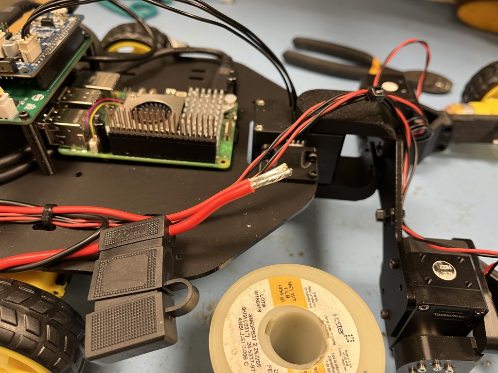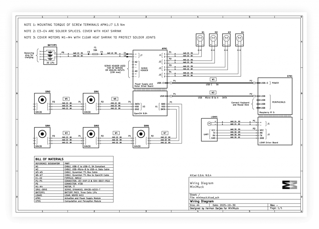 During the past week, I have finalised the electrical system by making a wiring diagram, calculating the power budget to select an appropriate battery and fixed issues with the motor and servo controller software on the OpenCM microcontroller.