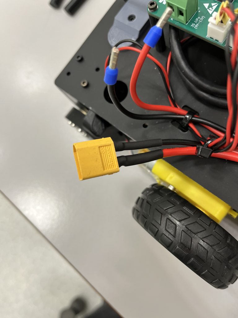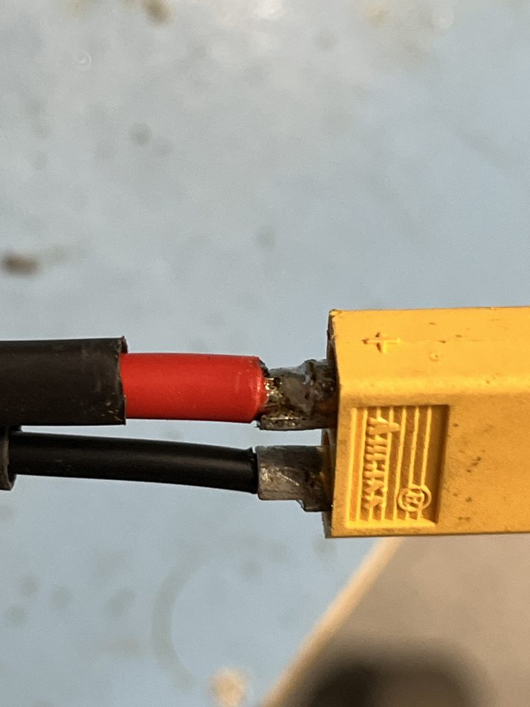 When ordering components for the PCB, I also ordered a fuse holder for standard 12V car fuse, with the plan to implement this in the wiring harness. To save money, the battery was brought from home, I soldered an XT60 connector and spliced the fuse holder wire with the wire from the power supply board and used cable ties to hold everything in place.