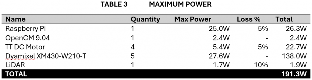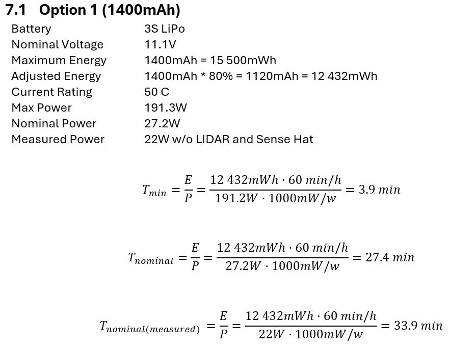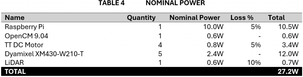 With the wiring diagram in place, it was now time to make a power budget to set the parameters for selecting a battery and fuse. Maximum and nominal power are calculated and compared to the measurements we did when testing as a verification to the budget. The maximum power is used for selecting the circuit breaker and battery max current, and the nominal power is used for selecting the battery capacity. To ensure loss is accounted for, I made a table for the loss cascade based on the wiring diagram. This gives the total amount of loss to be added to each component. The power budget is a rough estimate, not considering the nonlinearities of battery energy under different power. Tables below are extracted from the power budget document.