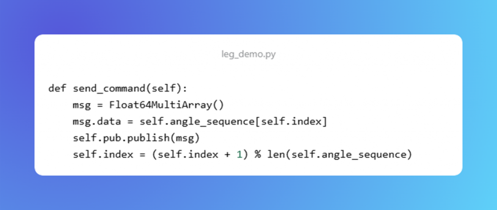 The leg_demo.py script consists of a given pattern for the legs to move to showcase some of the possible positions. Here is the function that publishes commands to the position controller.