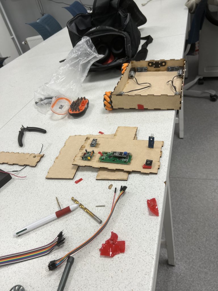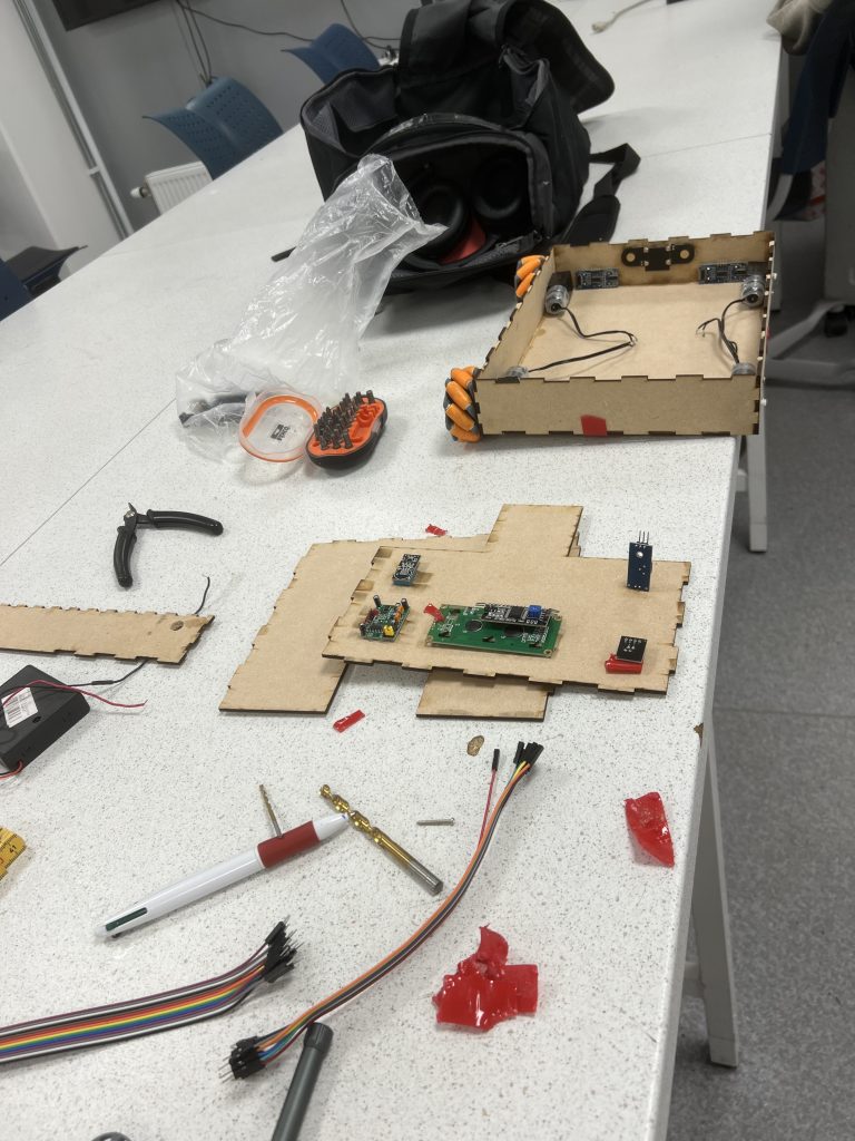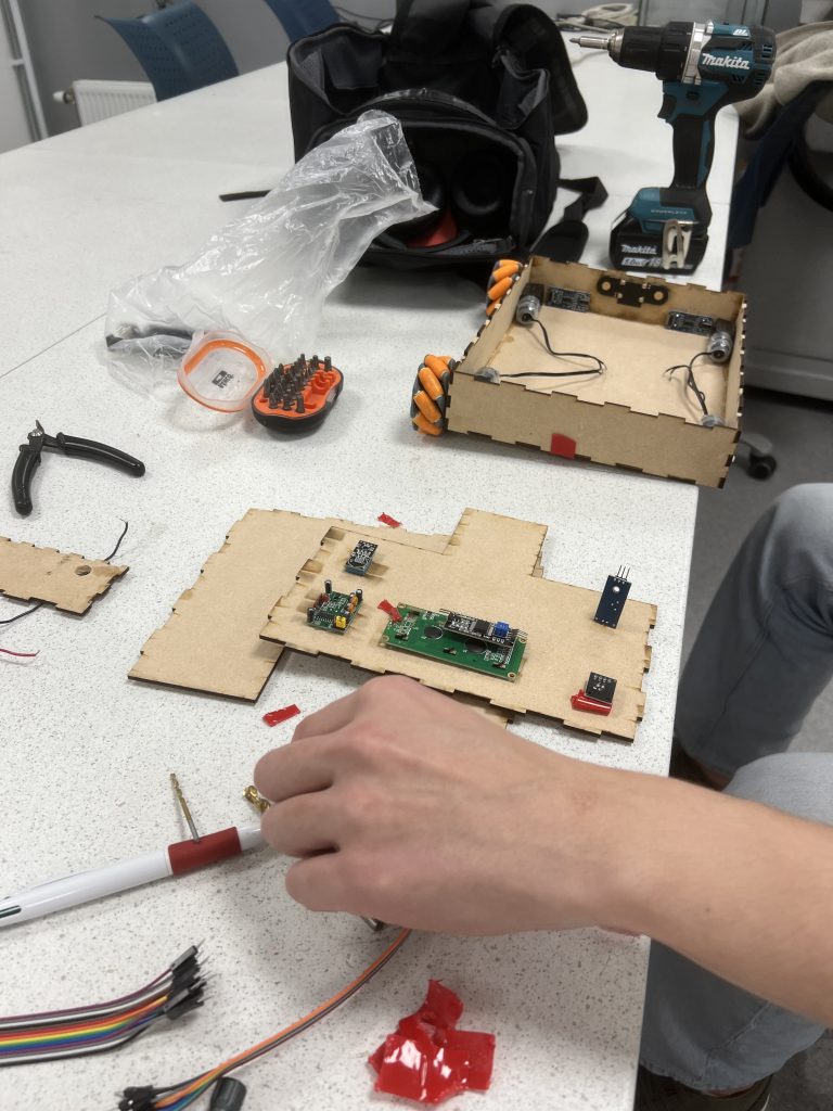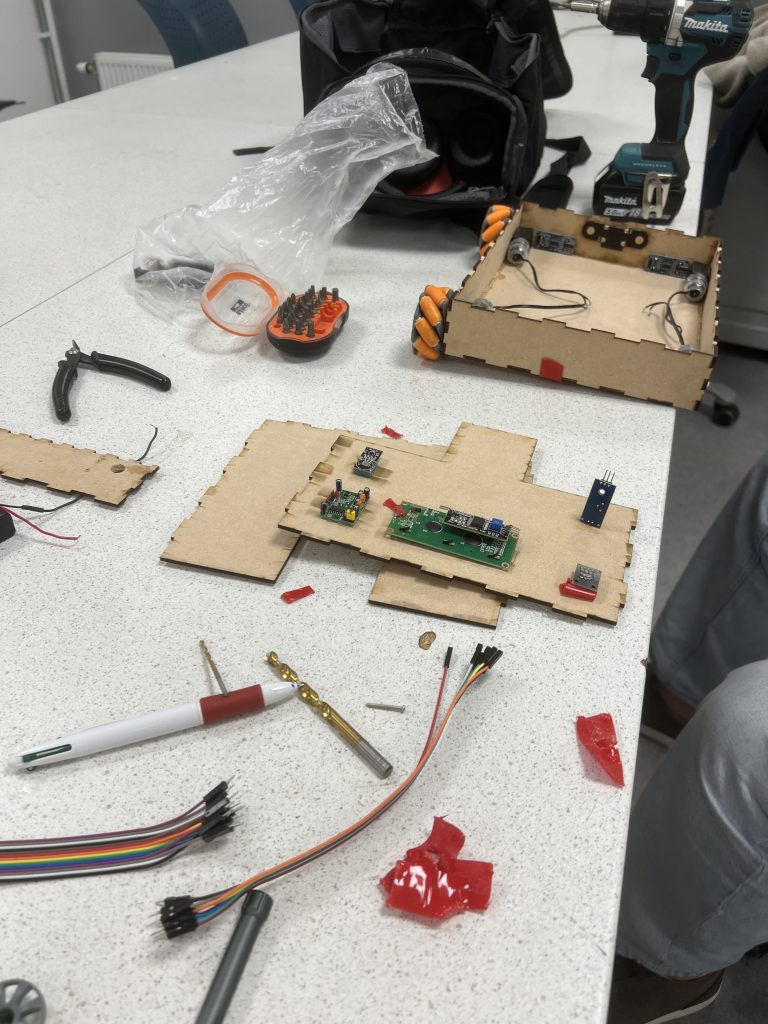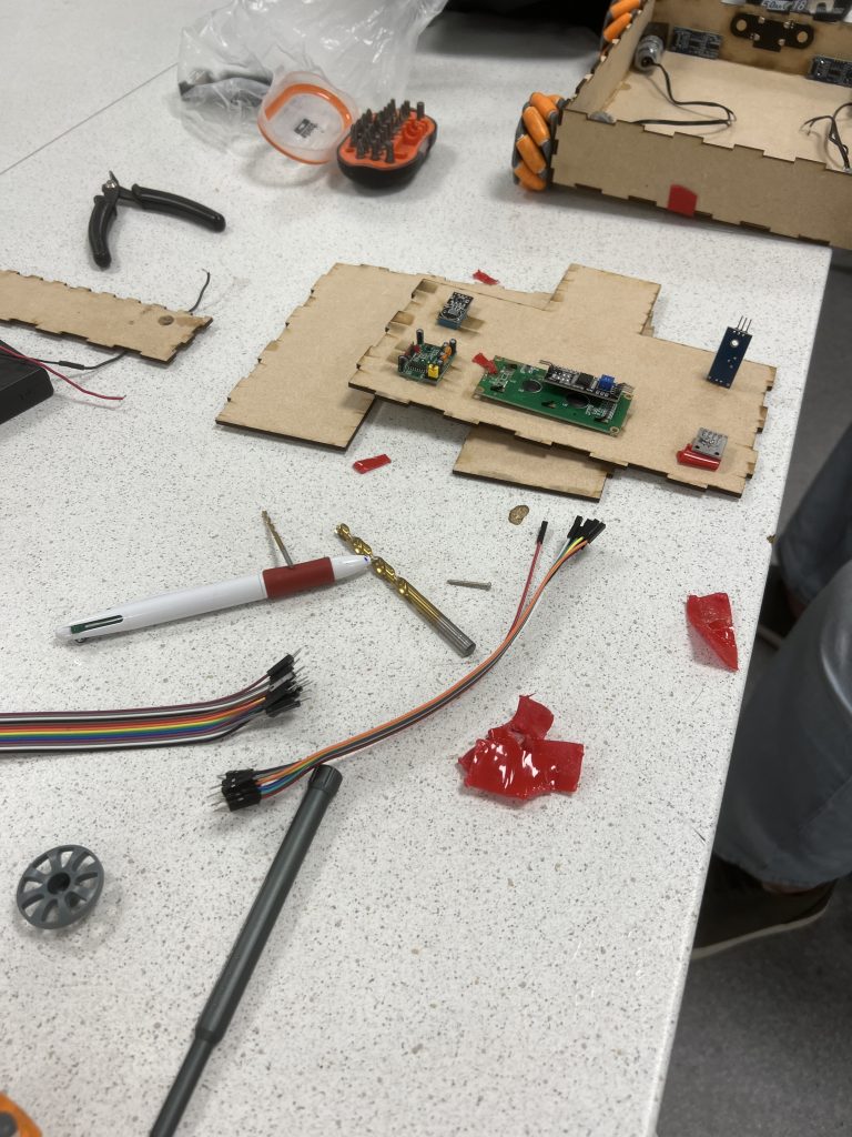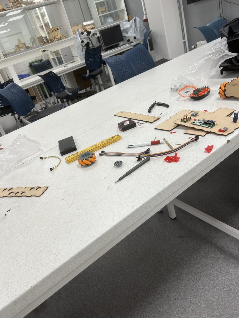 This week was spent on integration and iterating on the rover design. I cooperated with August a lot this week as seen in the pictures over. We created a new and better drawing for Richard, where we added more holes, including pre-cut holes for the wheels, this was to reduce the friction on the wheels which seemed to help.