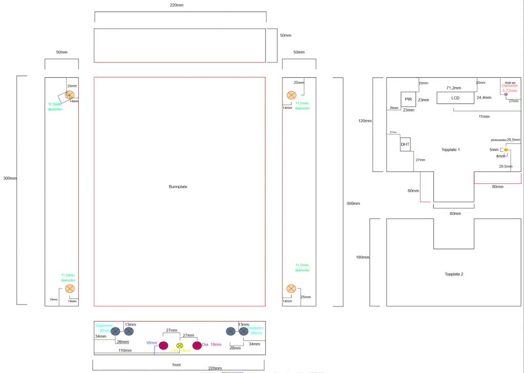 Jamal Safi once said, and i quote: “You have to iterate! Dont fall in love with your first idea!”. I now understand what he meant. It turned out that he wasn’t a crazy systems engineer after all. He was right all along. And iterate we did. We needed to get the placeholders to the frame for the camera and the ultrasonic sensors. Our first drawing (earlier week) witnesses our initial plan, to 3d print mounts for the ultrasonic sensors and the zero-cam. We later thought that it would be a great idea to just drill holes for them in the front of the frame. We measured all the sensors and the camera, and sketched a new design: