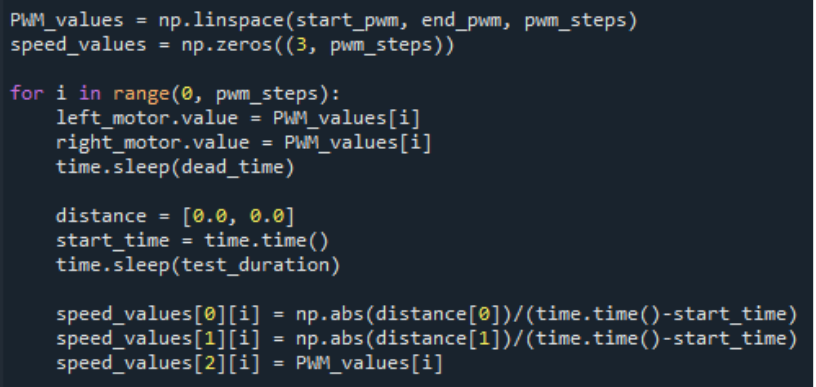 The calibration is pretty simple, I just need to run the motors with varying PWM and sample the speed it is going at each specific PWM value. Then we can graph it and/or copy the values directly and use this to set the correct PWM value when we want to run the vehicle at a specific speed.
