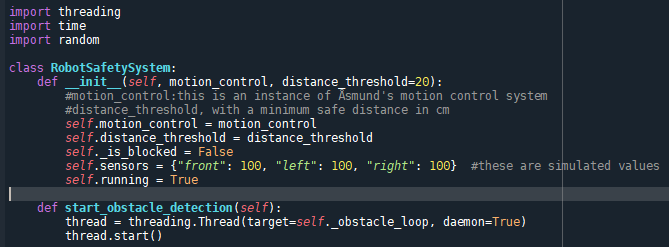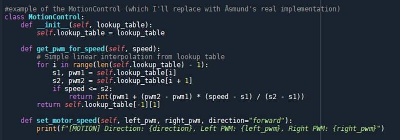 Making my own MotionControl that to simulate Åsmund’s code. The reason being that I need a testable environment to validate my own obstacle detection and avoidance logic. By making a MotionControl Class, I can mimic Åsmund’s interface (the set_motor_speed() and get_pwm_for_speed()), this way I can ensure compatibility early, further easing integration before it happens, rmaking sure that the integration will happen smoothly, and that my module and Åsmund’s will work well together. This way I can also run this independently without depending on Åsmund or having to wait for the complete finished module, I can work on my own time and test my code early. Also, this way I can stimulate realistic behavior, so even though I am taking a small portion of Åsmund’s part, it proves to be useful to my part at the end of the day.