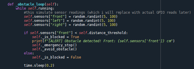 Since the physical robot is still not available, I continued using simulated sensor readings. However, the motor commands now reflect actual PWM values rather than placeholders, making the transition to hardware more seamless for later.