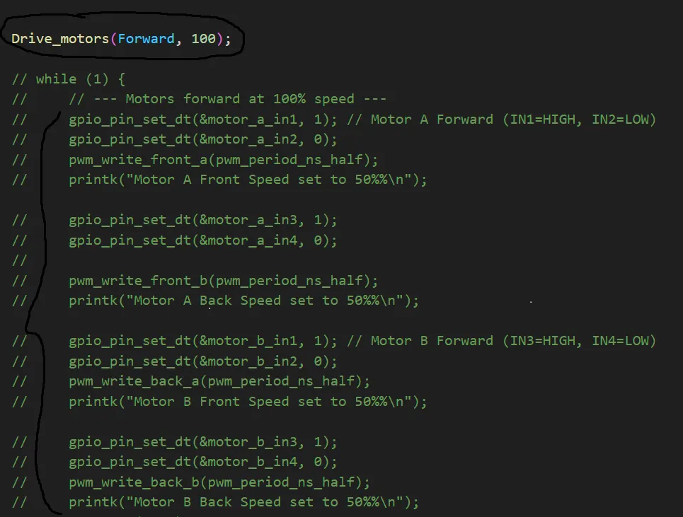for refrance the libraries will compress the whole code that is green with just that one line. And there will also be a function to controll individual motors if that is wanted.