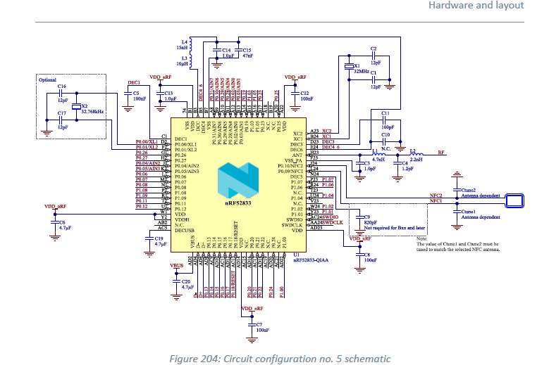 This week I have been looking at the pins we need for the microcontroller and compared it to the ones we already have on the microbit. I also looked into how I was going to design the circuit. When looking at the datasheet I found different reference circuits that I could use as a basis for the design. The circuit below is the one I am going to look at due to this being the only one containing an antenna.