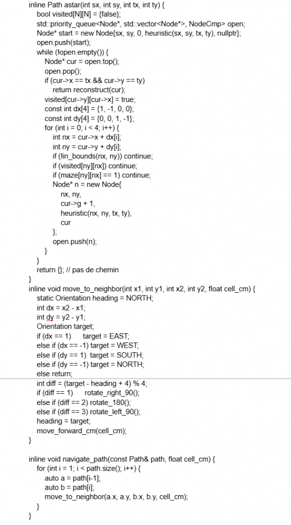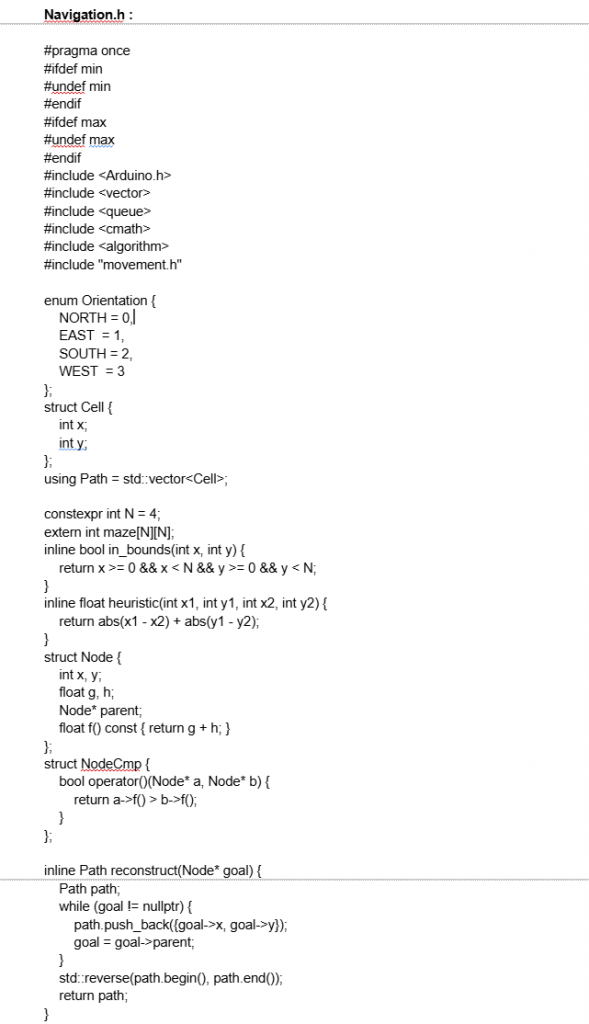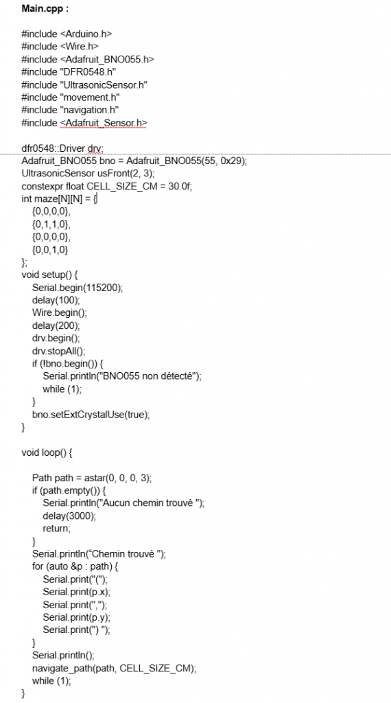 This week I was able to test the algorithm and it works in a square maze, as long as I give it the coordinates of its starting point and its destination. In the end, the issue I had last week had nothing to do with what Sondre was working on — it was caused by a poor file architecture and my IMU connection, which prevented the algorithm from actually running. For now, the car calculates a route and then follows it based on a matrix that represents the maze. I also created a movement module to improve and simplify my understanding of the motions and how the motors are used. What I will try to implement next week is enabling the car to calculate its route without knowing the position of obstacles beforehand, and if it encounters an obstacle, to recalculate its route accordingly. I should also improve the movement system to make its execution more precise, which will help increase the accuracy of the maze solving.