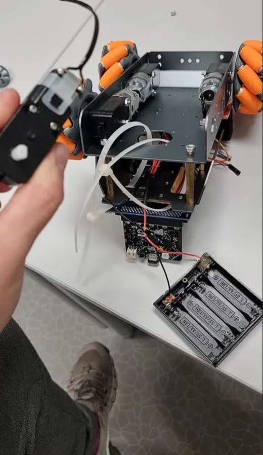 It was very hot. The power supply was also struggling since it started to send like 2,7 amps just to stabilize the voltage. i turned the power of and disconnected while waiting for the driver to cool down. After checking every spot that was supposed to give electricity from the micro-bit to the driver i concluded that the issue was not properly secured wires. After wards the supply got back to normal sending only about 0,5 A to power the whole car and all the wheels were spinning. I also looked into the driver some more and found out some more thing about it: