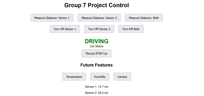 In our Group 7 project, I installed and configured a second ultrasonic sensor on the Raspberry Pi. Both sensors now read continuously and display their data together on a web dashboard. Using Flask, I built a simple interface that updates in real time, showing distances and a clear status: STOP when an object is closer than 5 cm, and DRIVING when it is safe.