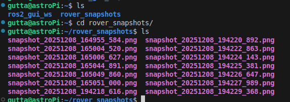 This function simply needs access to the currentImage() function in RosImageProvider, because it returns the most recently stored image from the camera, and then we just save this to a separate folder. So when the Snapshot button is pressed on the dashboard, it calls a takeSnapshot() function in RosNode, which retrieves the latest image via currentImage() and saves it in the “/rover_snapshots” folder.