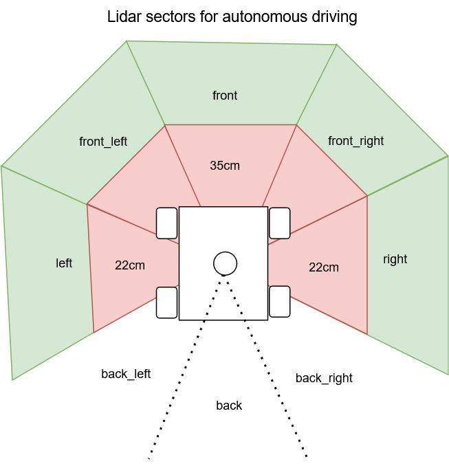 The LiDAR code from an earlier week, was used in the newly made autonomous_node. The LiDAR code from earlier was split up in 7 different sectios, corelating to the 7-axis movement of the car. The LiDAR code filters invalid measurements, and finds the minimum distance in each sector. Since the motor_driver_node used /cmd_vel we planned to have the autonomous node publish on to this topic, from the decisions made with the measurements from the LiDAR. We used our experience gained from intelligent real-time systems, but this time with a much more sophisticated sensor. Since we had split up the LiDAR in 7 seven sectors, we used the same logic. Check picture for what sectors being used in this project.