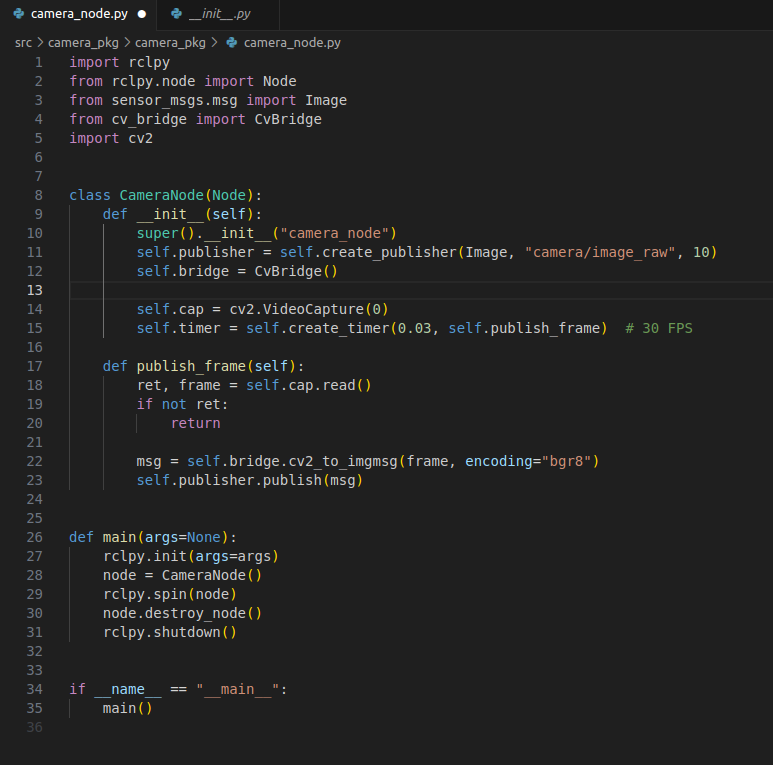 Here we have the code that implements the camera node. We import “rclpy” and “Node,” which give us ROS2 functionality. OpenCV is a library that makes it easier to process and analyze images and video, and here it is used to read frames from the camera. cv_bridge is used to convert OpenCV images into ROS2 messages. These libraries give me everything I need for the camera to work with the ROS system.