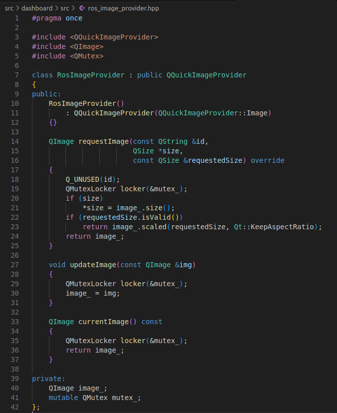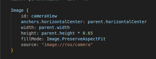 The feed itself comes through the source field, which points to “image://ros/camera”, which in turn receives the images from a RosImageProvider class defined in the code. This class receives updated images from the camera node and makes them available to QML. The class has two important functions: