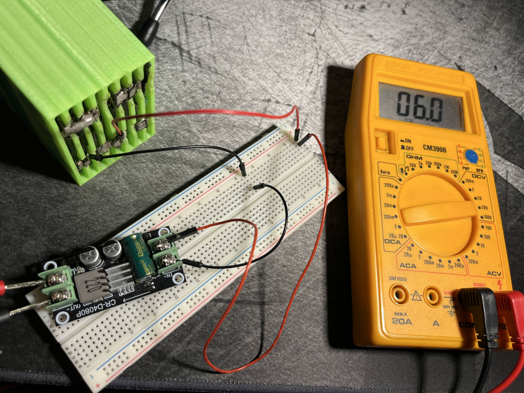 Furthermore I tested the buck converters. I didn’t want to struggle with the BMS setup again, so I tested it with 2 of the batteries (10V, the input voltage range is 7-38V). This then gave me 6V even tho the datasheet said it should be 5?