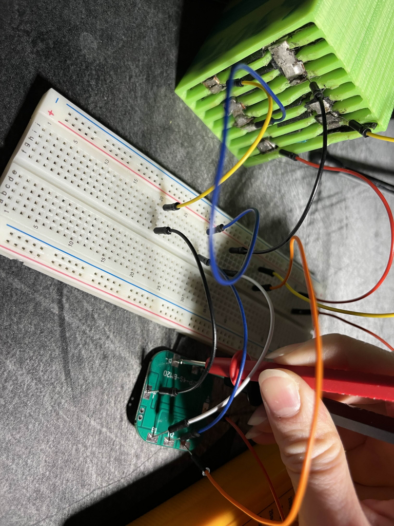 I then tested the BMS which was difficult since I don’t own any clamps and it was hard to make sure the cables stayed in place. The setup therefore ended up looking a bit questionable, but it worked and showed the BMS gave us an output of 12 V.